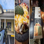Three red-steak, chorizo, and cheese tacos. served with a side of fries topped with queso dip and your choice of salsa.
